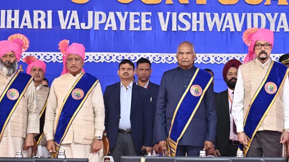 रायपुर। अटल बिहारी वाजपेयी विश्वविद्यालय के छठवें दीक्षांत समारोह का आयोजन पूर्व राष्ट्रपति रामनाथ कोविंद के मुख्य आतिथ्य में गरिमामय वातावरण में किया गया। कार्यक्रम की अध्यक्षता राज्यपाल रमेन डेका ने की। अति विशिष्ट अतिथि के तौर पर मुख्यमंत्री विष्णु देव साय, विशिष्ट अतिथि उपमुख्यमंत्री अरुण साव तथा उच्च शिक्षा मंत्री टंकराम वर्मा शामिल हुए। कार्यक्रम में विश्वविद्यालय के कुलपति आचार्य डॉ. दिवाकर नाथ वाजपेयी उपस्थित रहे। समारोह में 64 शोद्यार्थियों को शोध उपाधि, 92 गोल्ड मेडल एवं 36950 स्नातक एवं स्नातकोत्तर उपाधि दी गई।