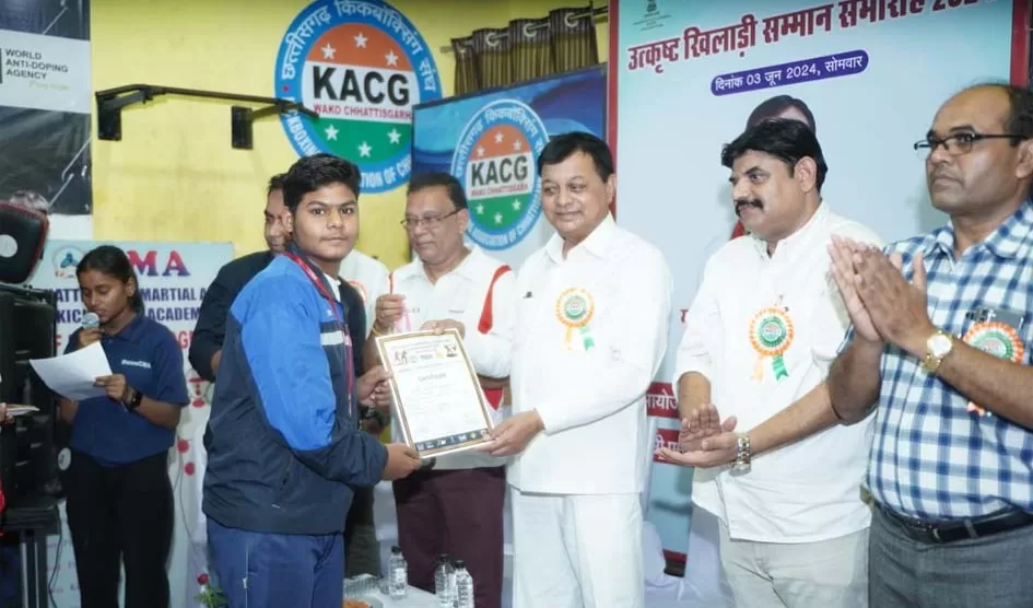 छत्तीसगढ़ किकबाकसिंग एसोसिएशन के संस्थापक एवं कार्यकारी अध्यक्ष तारकेश मिश्रा ने बताया कि उक्त सम्मान समारोह में मुख्य अतिथि छत्तीसगढ़ शासन के मंत्री मा. लखन देवांगन देवांगन ने सभी खिलाड़ियों को पुरस्कृत कर सम्मानित किया। इन्होंने एकेडमी के प्रशिक्षकों एवं खिलाड़ियों को राष्ट्रीय प्रतियोगिता में बेहतरीन प्रदर्शन कर राज्य को देश में सेकंड रनर अप ट्राफी जितने पर बधाई दी। इन्होंने अपने संबोधन में कहा कि विकसित भारत के निर्माण में सभी आयामों के साथ-साथ खेल और खिलाड़ियों की भी अहम भूमिका है। किकबाक्सिंग खेल से मनोबल बढ़ता है और इस खेल के विकास के लिए वे हर संभव सहयोग करते रहेंगे।