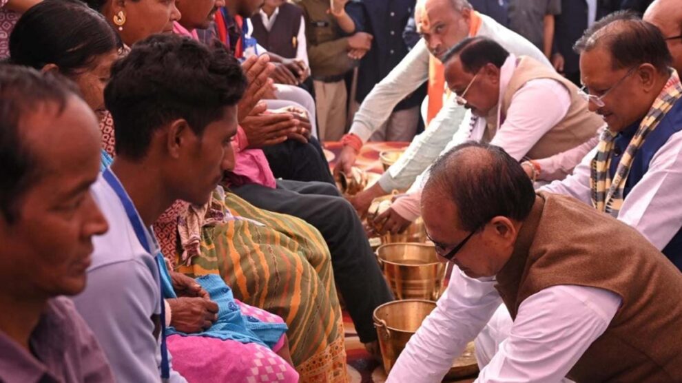 रायपुर। केंद्रीय कृषि तथा ग्रामीण विकास मंत्री शिवराज सिंह चौहान और मुख्यमंत्री विष्णु देव साय ने आज दुर्ग जिले के ग्राम नगपुरा में आयोजित मोर आवास मोर अधिकार कार्यक्रम में प्रधानमंत्री जनमन योजना, नियद नेल्ला नार योजना और प्रधानमंत्री आवास योजना के लाभार्थियों का पांव पखारकर अभिनंदन किया।