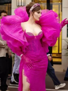 उर्वशी रौतेला पिंक कलर के डीप नेक थाई-हाई स्लिट गाउन में काफी हॉट लग रहीं थीं। ड्रेस के साथ उर्वशी ने मैचिंग ग्लब्स भी पहने हुए हैं जो उनके लुक को और भी एलिगेंट बना रहे हैं।