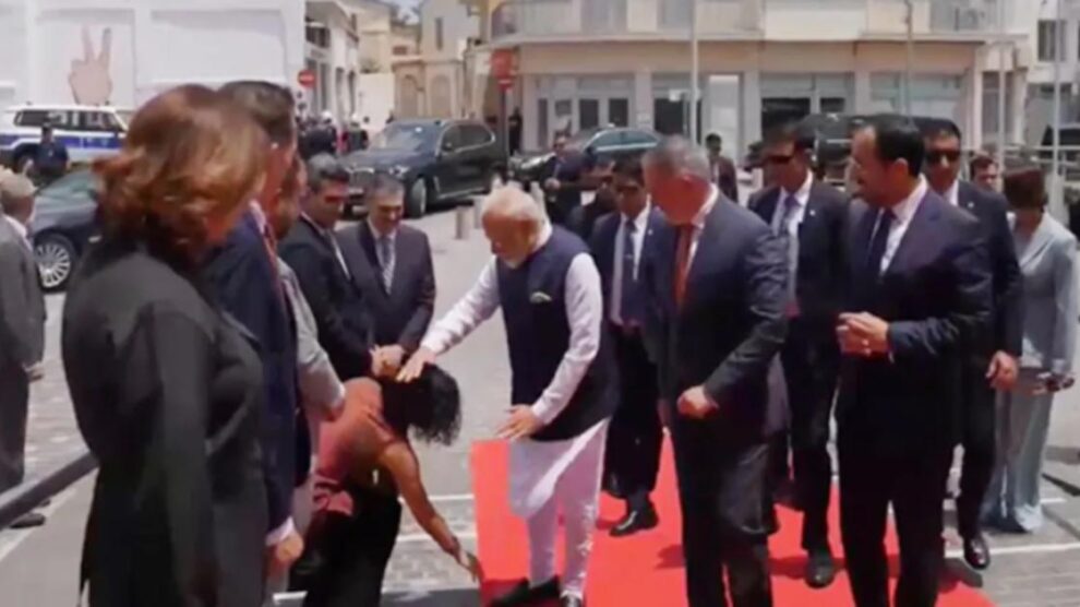 सामने आया वीडियो- प्रधानमंत्री नरेंद्र मोदी सोमवार को साइप्रस के राष्ट्रपति निकोस क्रिस्टोडौलिडेस के साथ निकोसिया के ऐतिहासिक केंद्र पहुंचे थे। इस दौरान निकोसिया परिषद की सदस्य माइकेला काइथ्रेओटी म्हाल्पा ने पारंपरिक तरीके से प्रधानमंत्री मोदी के पैर छूकर उनका स्वागत किया। प्रधानमंत्री मोदी ने सांसद के इस अभिवादन को विनम्रतापूर्वक स्वीकार किया है।