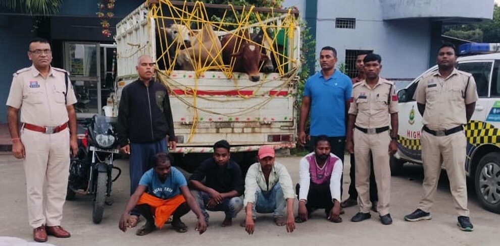 दरअसल 29 अक्टूबर को मुखबीर से पुलिस को पशु तस्करी मामले की जानकारी मिली थी। सूचना के आधार पर थाना उरगा पुलिस टीम द्वारा ग्राम सराईपाली पंचायत रिवापार में घेराबंदी कर दबिश दी गई, जहां एक सफेद रंग का पीकअप वाहन क्रमांक CG 29 A 4865 में 07 रास बैल अवैध रूप से परिवहन करते हुए पाया गया। वाहन चालक एवं उसके साथियों से पूछताछ पर पता चला कि ये लोग बैलों को जशपुर जिला से उत्तर प्रदेश की ओर बूचड़खाने में वध हेतु ले जा रहे थे। उक्त वाहन में रखे गए पशुओं के परिवहन संबंधी कोई वैध दस्तावेज अथवा अनुमति पत्र प्रस्तुत नहीं किया गया। घटनास्थल पर वाहन चालक एवं साथियों को हिरासत में लेकर पशुओं को सुरक्षित किया गया तथा समक्ष गवाहों के उपस्थिति में बरामदगी पंचनामा तैयार किया गया।