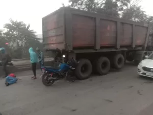 0 खड़ी ट्रेलर में घुसी बाइक