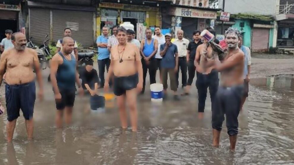 कोरबा। सड़क के गड्ढों में बारिश का पानी भर जाने से कुसमुण्डा क्षेत्रवासी परेशान हैं। इसे लेकर आज व्यापारियों ने अनोखा प्रदर्शन किया। व्यापारियों ने सड़क में मौजूद गड्ढों में भरे पानी से नहाकर शासन-प्रशासन का ध्यान इस ओर लाने का प्रयास किया है।