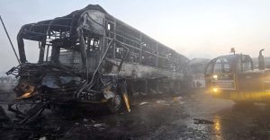 मथुरा। उत्तर प्रदेश के मथुरा में दिल्ली-आगरा एक्सप्रेसवे पर दर्दनाक सड़क हादसा हो गया है। मंगलवार तड़के चार बजे एक्सप्रेस वे पर एक के बाद एक सात बसों की आपस में टक्कर हो गई। हादसे के बाद बसों में आग लग गई और चार लोगों की मौत हो गई, जबकि 25 लोग घायल हैं। इस घटना के बाद पूरे लोगों में चीख पुकार मच गई। पुलिस की टीम मौके पर पहुंचकर राहत कार्य कर रही है।