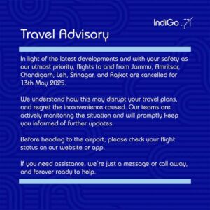 देश की प्राइवेट एयरलाइंस कंपनी इंडिगो ने यात्रियों के लिए इस बारे में एडवाइजरी जारी की है। एक्स पर एक पोस्ट में कहा, ” जम्मू, अमृतसर, चंडीगढ़, लेह, श्रीनगर और राजकोट से आने-जाने वाली उड़ानें 13 मई 2025 तक रद्द कर दी गई हैं.”