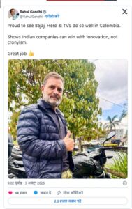 राहुल गांधी ने कोलंबिया की सड़कों पर बजाज पल्सर मोटरसाइकिल के सामने खड़े होकर एक तस्वीर सोशल मीडिया प्लेटफॉर्म एक्स पर साझा की। साथ ही लिखा कि बजाज, हीरो और टीवीएस को कोलंबिया में इतना अच्छा प्रदर्शन करते देखकर गर्व महसूस हो रहा है। यह दर्शाता है कि भारतीय कंपनियां साठगांठ वाले पूंजीवाद से नहीं, बल्कि नवाचार से सफलता हासिल कर सकती हैं।
