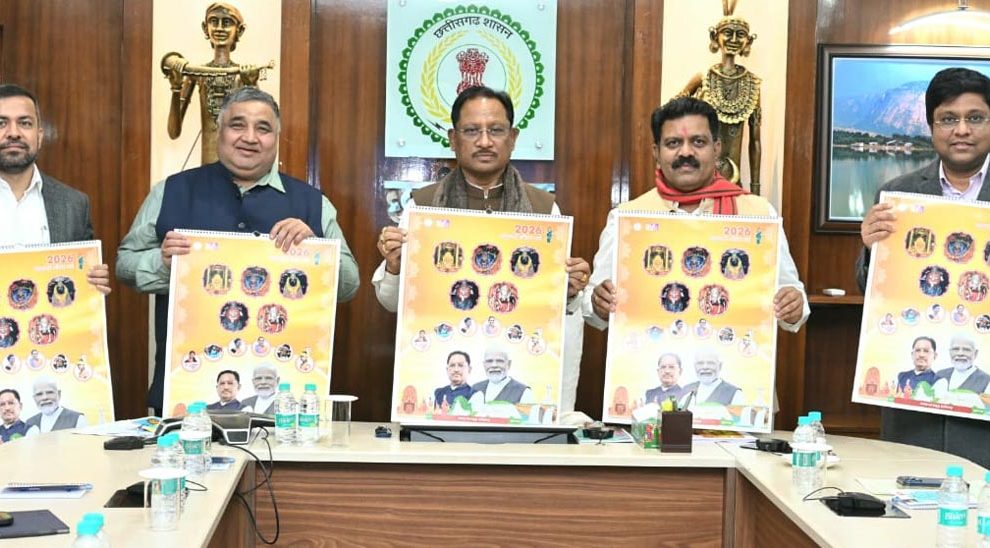 रायपुर। मुख्यमंत्री विष्णु देव साय ने राजधानी रायपुर स्थित मुख्यमंत्री निवास कार्यालय में वर्ष 2026 के शासकीय कैलेंडर का विमोचन किया। वर्ष 2026 को राज्य सरकार द्वारा ‘महतारी गौरव वर्ष’ के रूप में मनाया जा रहा है। इसी थीम पर आधारित यह कैलेंडर सशक्त एवं समृद्ध छत्तीसगढ़ के संकल्प को अभिव्यक्त करता है।