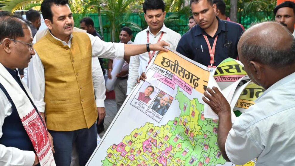 रायपुर। मुख्यमंत्री निवास में आयोजित जनदर्शन कार्यक्रम के दौरान सारंगढ़–बिलाईगढ़ जिले के ग्राम चकरदा निवासी पेंटर शिवकुमार निराला ने अनूठा ‘राजनीतिक मानचित्र’ मुख्यमंत्री विष्णु देव साय को भेंट किया। उनकी इस अद्वितीय कला प्रस्तुति ने कार्यक्रम का विशेष आकर्षण बढ़ा दिया।