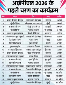आईपीएल 2026 के पहले चरण का कार्यक्रम जारी हो चुका है। भारतीय क्रिकेट कंट्रोल बोर्ड (BCCI) ने बुधवार को 19वें सीजन के शुरुआती मुकाबलों का कार्यक्रम घोषित किया। दुनिया की सबसे लोकप्रिय टी20 फ्रेंचाइजी लीग का यह सीजन 28 मार्च से शुरू होगा और पहले चरण के मुकाबले 12 अप्रैल तक खेले जाएंगे।