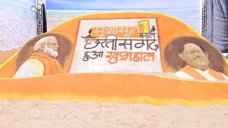 रायपुर। छत्तीसगढ़ सरकार के एक वर्ष पूर्ण होने पर राजधानी रायपुर स्थित साइंस कॉलेज में आयोजित ‘जनादेश परब’ कार्यक्रम में पद्मश्री से सम्मानित सैंड आर्टिस्ट...